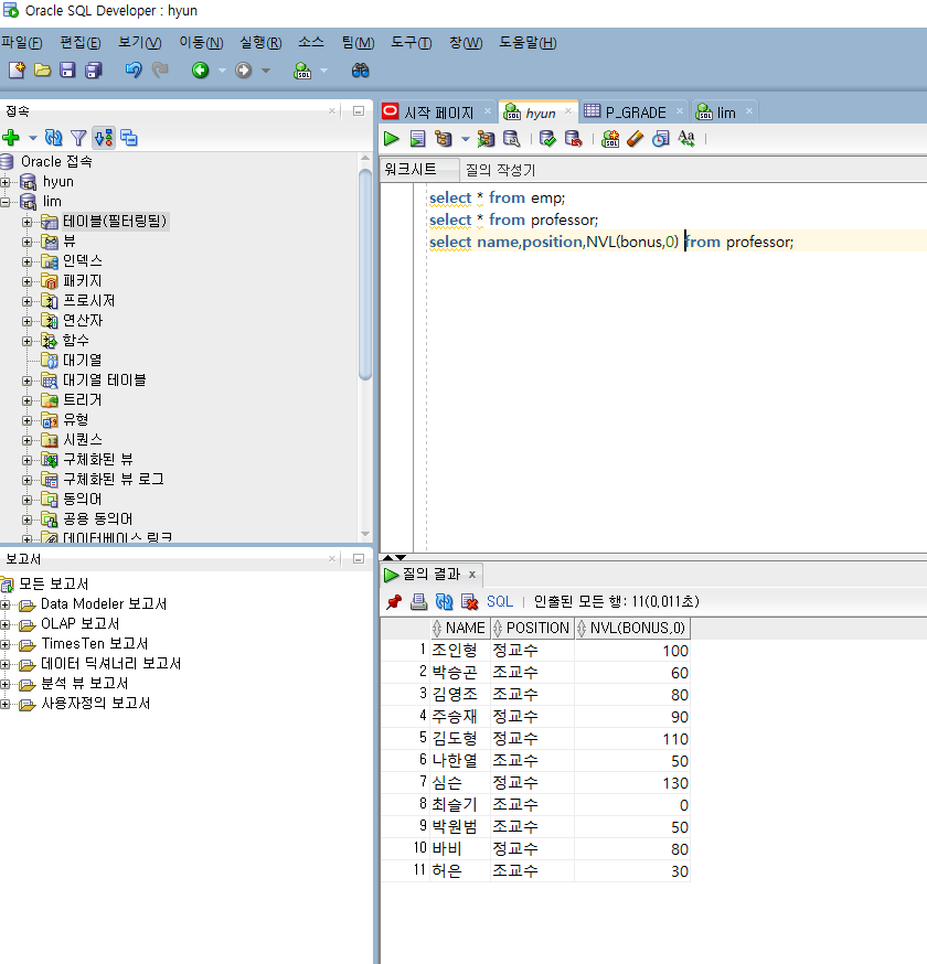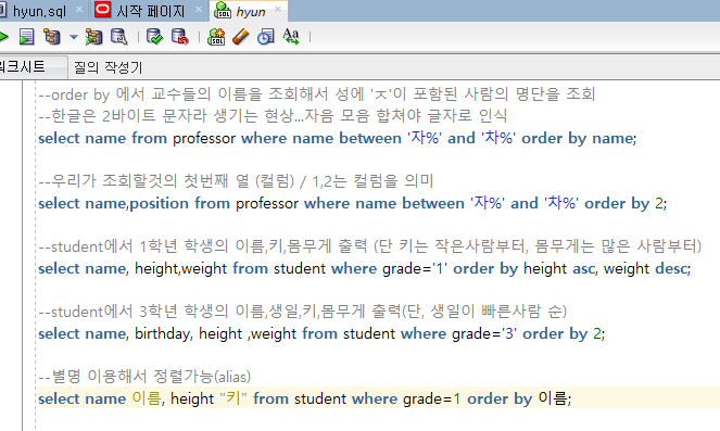 --어제 복습문제 --1. professor 테이블에서 name,pay를 각각 교수명, 급여로 이름변경후 조회하시오 select name 교수명, pay 급여 from professor; --2. dept2 테이블의 Area를 중복제거하고 출력해보세요 select distinct area from dept2; --3.emp테이블에서 -SMTH님의 직업은 CLERK입니다 이렇게 출력하세요 select ename || ' 님의 직업은 ' || job || '입니다' from emp; --4.professor 에서 이름,급여,보너스,총급여 출력하세요 (pay와 bonus합한게 총급여) select name 이름, pay 급여, bonus 보너스, pay+bonus 총급여 from professor; --5. ..