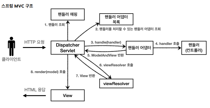 스프링 MVC 전체 구조 직접 만든 MVC 프레임워크와 스프링 MVC를 비교해보자. 직접 만든 MVC 프레임워크 구조  SpringMVC 구조 직접 만든 프레임워크 스프링 MVC 비교 FrontController → DispatcherServlethandlerMappingMap → HandlerMapping MyHandlerAdapter → HandlerAdapterModelView → ModelAndViewviewResolver → ViewResolverMyView → View DispatcherServlet 구조 살펴보기org.springframework.web.servlet.DispatcherServle 스프링 MVC도 프론트 컨트롤러 패턴으로 구현되어 있다.스프링 MVC의 프론트 컨트롤러가 바로 ..