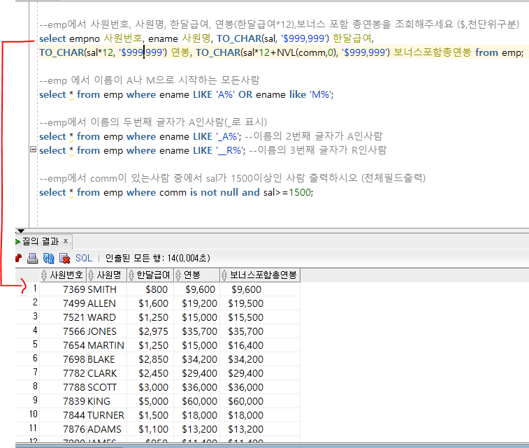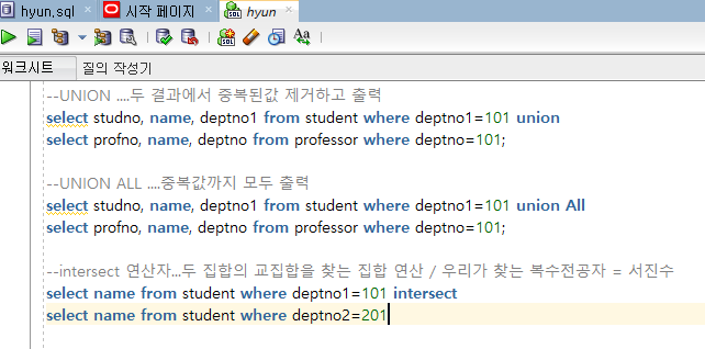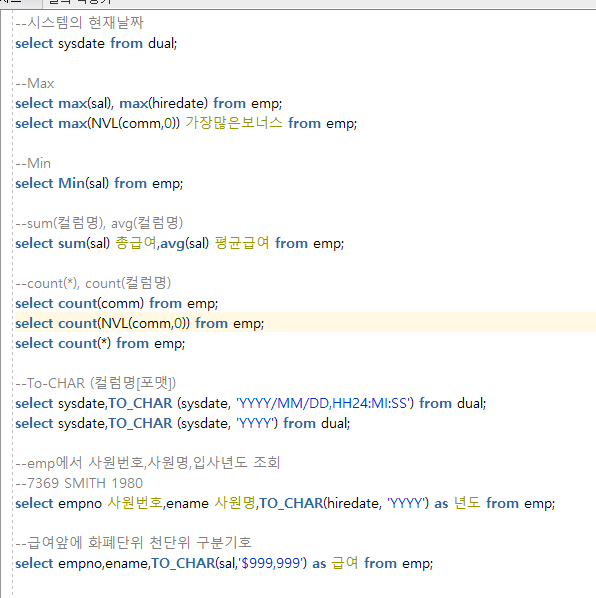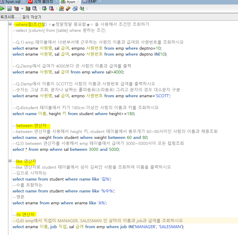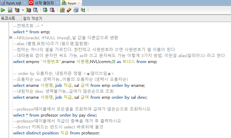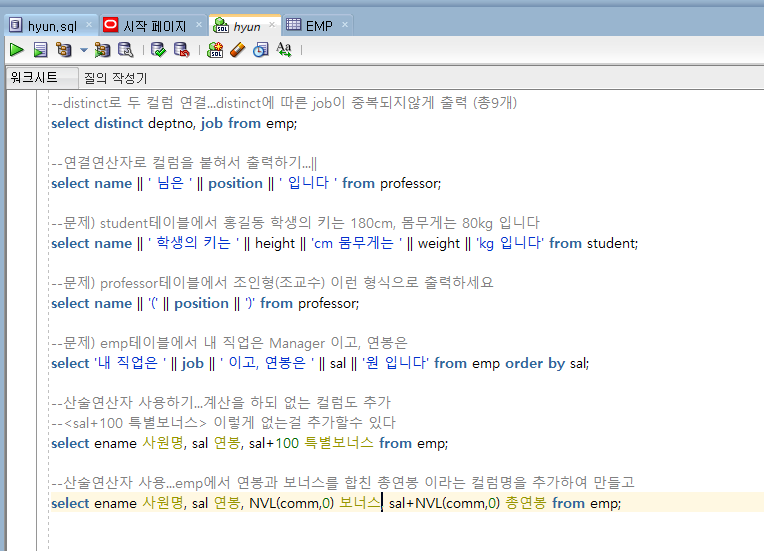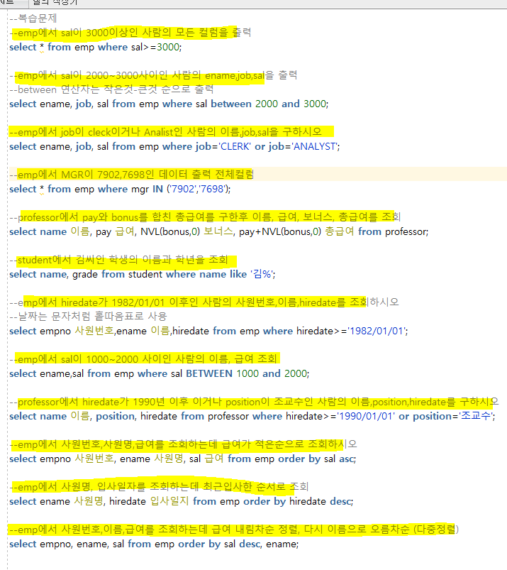 --어제 복습문제 --1. professor 테이블에서 name,pay를 각각 교수명, 급여로 이름변경후 조회하시오 select name 교수명, pay 급여 from professor; --2. dept2 테이블의 Area를 중복제거하고 출력해보세요 select distinct area from dept2; --3.emp테이블에서 -SMTH님의 직업은 CLERK입니다 이렇게 출력하세요 select ename || ' 님의 직업은 ' || job || '입니다' from emp; --4.professor 에서 이름,급여,보너스,총급여 출력하세요 (pay와 bonus합한게 총급여) select name 이름, pay 급여, bonus 보너스, pay+bonus 총급여 from professor; --5. ..