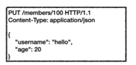 PUT 리소스가 있으면 완전히 대체해줌 리소스가 없으면 생성해줌 쉽게 이야기해서 덮어버리는 메서드 중요! 클라이언트가 리소스를 식별 클라이언트가 구체적인 리소스 전체 위치를 알고 URI를 지정한다 (이게 POST와의 차이) PUT은 사실 리소스를 수정하는것보다 리소스를 완전히 갈아치우기 때문에 리소스 수정에는 적합하지 않다. 수정 의도로 사용하려면 PATCH를 사용해야한다. (PUT 후에 PATCH가 새로나옴) PATCH PATCH는 age만 부분변경 가능하다 DELETE 리소스제거