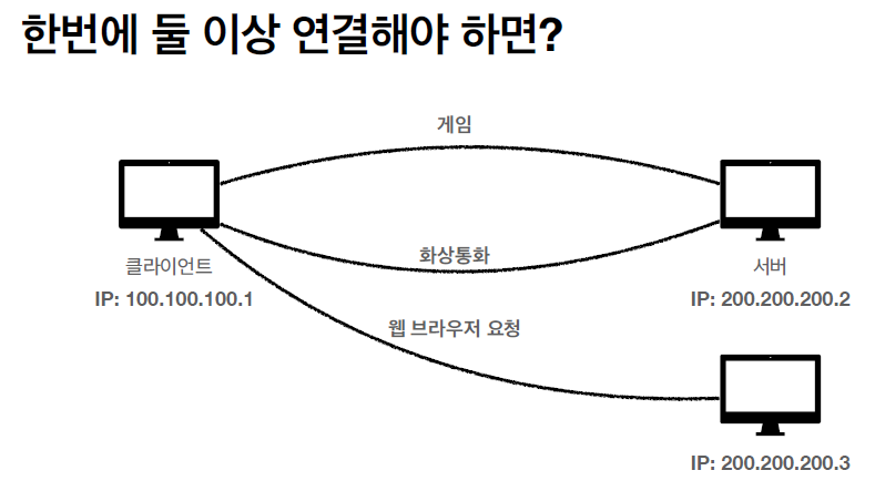 내 PC에서 게임, 화상통화, 웹 브라우저를 사용하고 있다. (클라 PC가 여러개 서버랑 통신해야한다.) 내 IP로 패킷들이 날라올텐데 게임, 화상통화, 웹브라우저 중 어디에 필요한 패킷인지 알 수 없다. 이때 PORT로 구분한다. IP - 목적지 서버를 찾는거 (아파트) PORT - 서버안에서 돌아가는 애플리케이션을 찾는거 (몇동, 몇호) PORT 0 ~ 65535 까지 할당 가능 0 ~ 1023 : 잘 알려진 포트로 사용하지 않는것이 좋음 FTP - 20, 21 TELNET - 23 HTTP - 80 HTTPS - 443