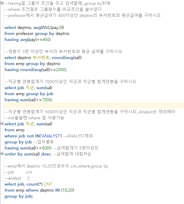 --where 조건절은 그룹함수를 비교조건을 쓸수없다