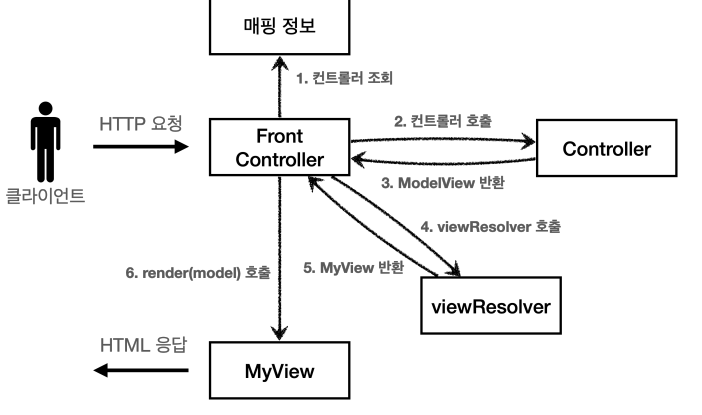 - 여기서 Front Controller라는 용어가 사용되는데, Front Controller는 주로 서블릿 컨테이너의 제일 앞에서 서버로 들어오는 클라이언트의 모든 요청을 받아서 처리해주는 컨트롤러로써, MVC 구조에서 함께 사용되는 디자인 패턴입니다