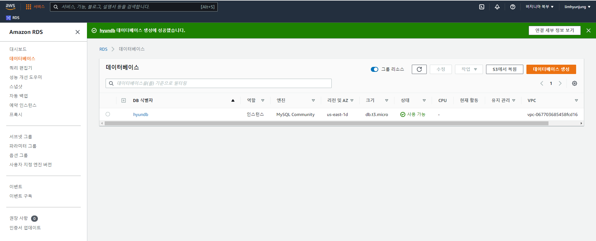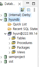 5. 생성하고 난 후엔 db식별자의 hyundb 클릭해서 들어가서 또 여러설정 해줘야한다.