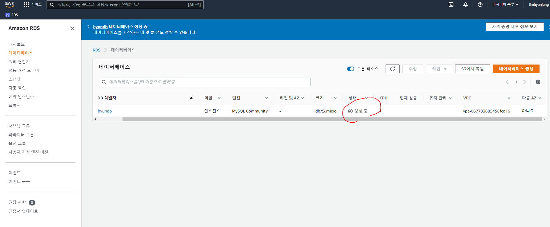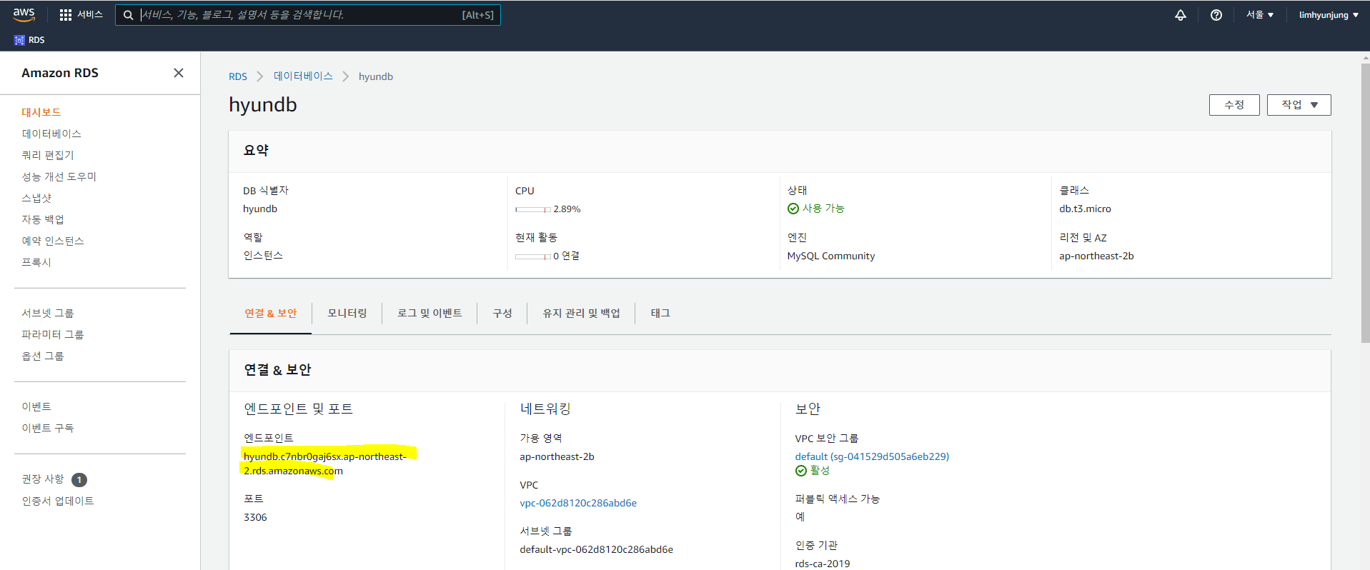 (엔드포인트) hyundb.c7nbr0gaj6sx.ap-northeast-2.rds.amazonaws.com