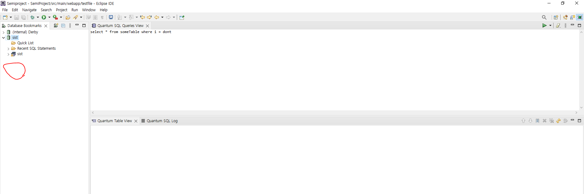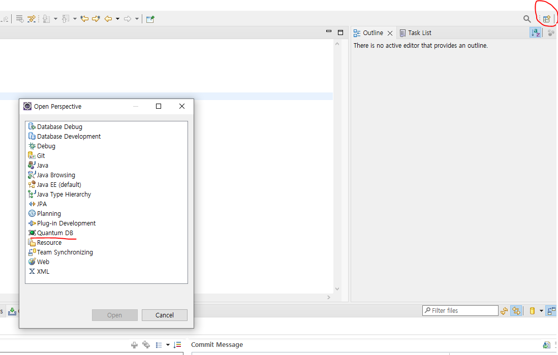 우측상단에 저 버튼 눌러서 퀀텀DB 선택하면 이클립스에서 퀀텀DB 바로가는 바로가기 생긴다 (우측상단에)