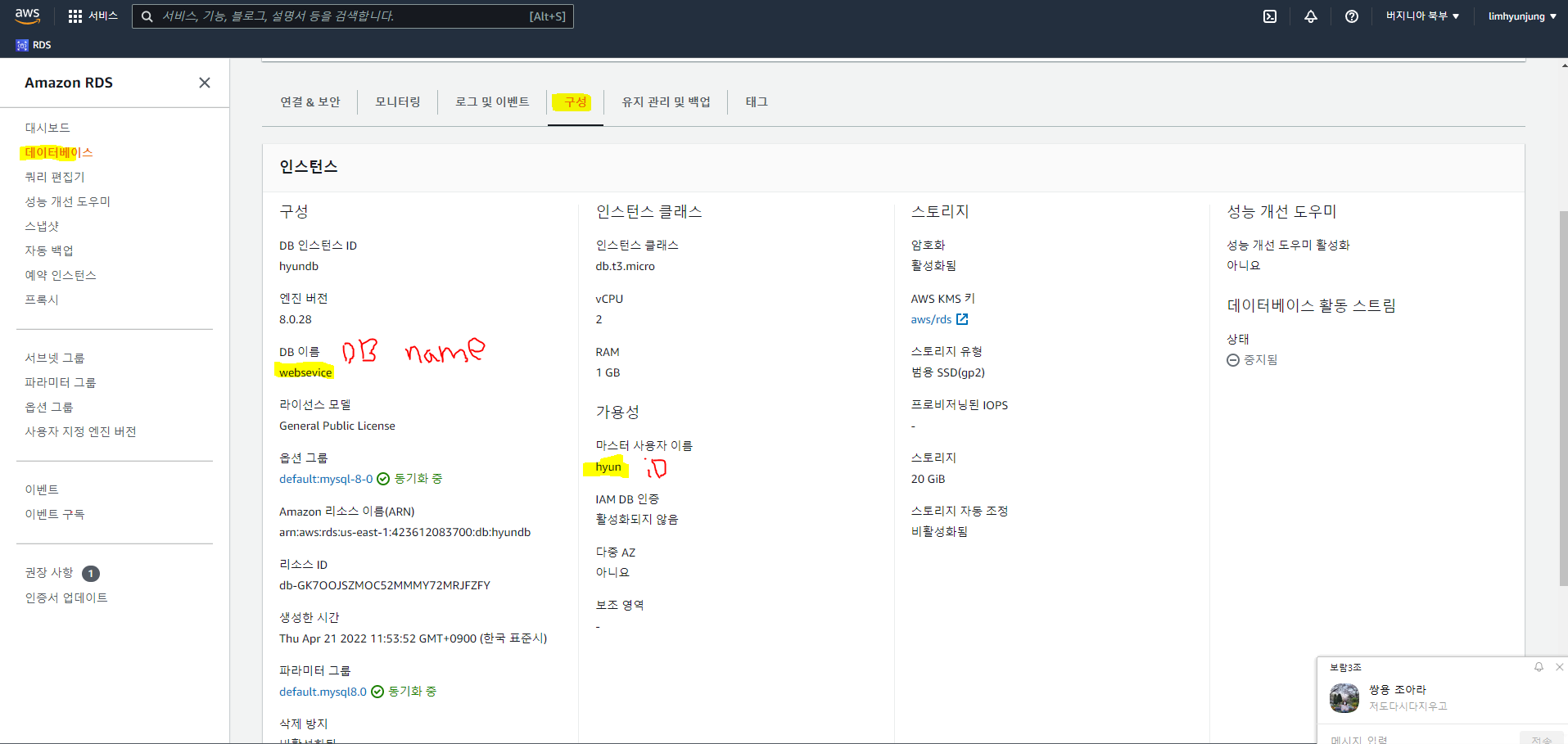 12. 만약 datebase name 까먹었으면 AWS홈페이지 > RDS > 데이터베이스 > 구성 탭에 들어가서 볼수있음