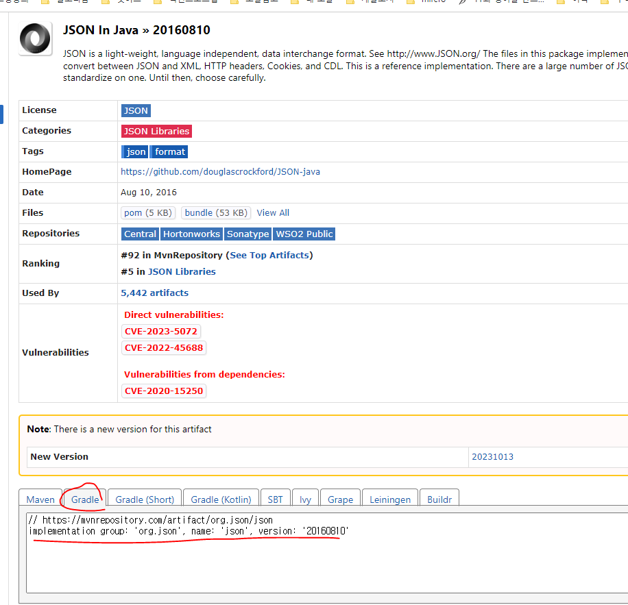implementation group: 'org.json', name: 'json', version: '20160810'