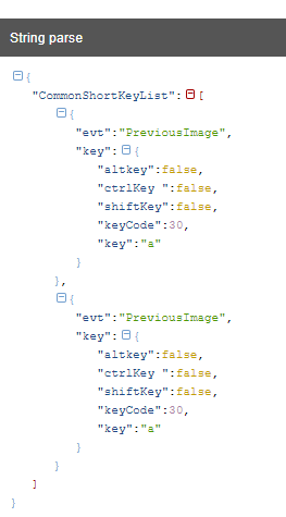 {"CommonShortKeyList" : [{ "evt" : "PreviousImage", "key" : { "altkey" : false, "ctrlKey ": false, "shiftKey" : false, "keyCode": 30, "key" : "a"}},{ "evt" : "PreviousImage", "key" : { "altkey" : false, "ctrlKey ": false, "shiftKey" : false, "keyCode": 30, "key" : "a"}}]}