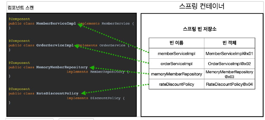 컴포넌트 스캔과 의존관계 자동 주입 시작하기 지금까지 스프링 빈을 등록할 때는 자바 코드의 @Bean이나 XML의 등을 통해서 설정 정보에 직접 등록할 스프링 빈을 나열했다. 예제에서는 몇개가 안되었지만, 이렇게 등록해야 할 스프링 빈이 수십, 수백개가 되면 일일이 등록하기도 귀찮고, 설정 정보도 커지고, 누락하는 문제도 발생한다. 역시 개발자는 반복을 싫어한다. (무엇보다 귀찮다ㅠㅠ) 그래서 스프링은 설정 정보가 없어도 자동으로 스프링 빈을 등록하는 컴포넌트 스캔이라는 기능을 제공한다. 또 의존관계도 자동으로 주입하는 @Autowired 라는 기능도 제공한다. 코드로 컴포넌트 스캔과 의존관계 자동 주입을 알아보자. 먼저 기존 AppConfig.java는 과거 코드와 테스트를 유지하기 위해 남겨두고, 새..